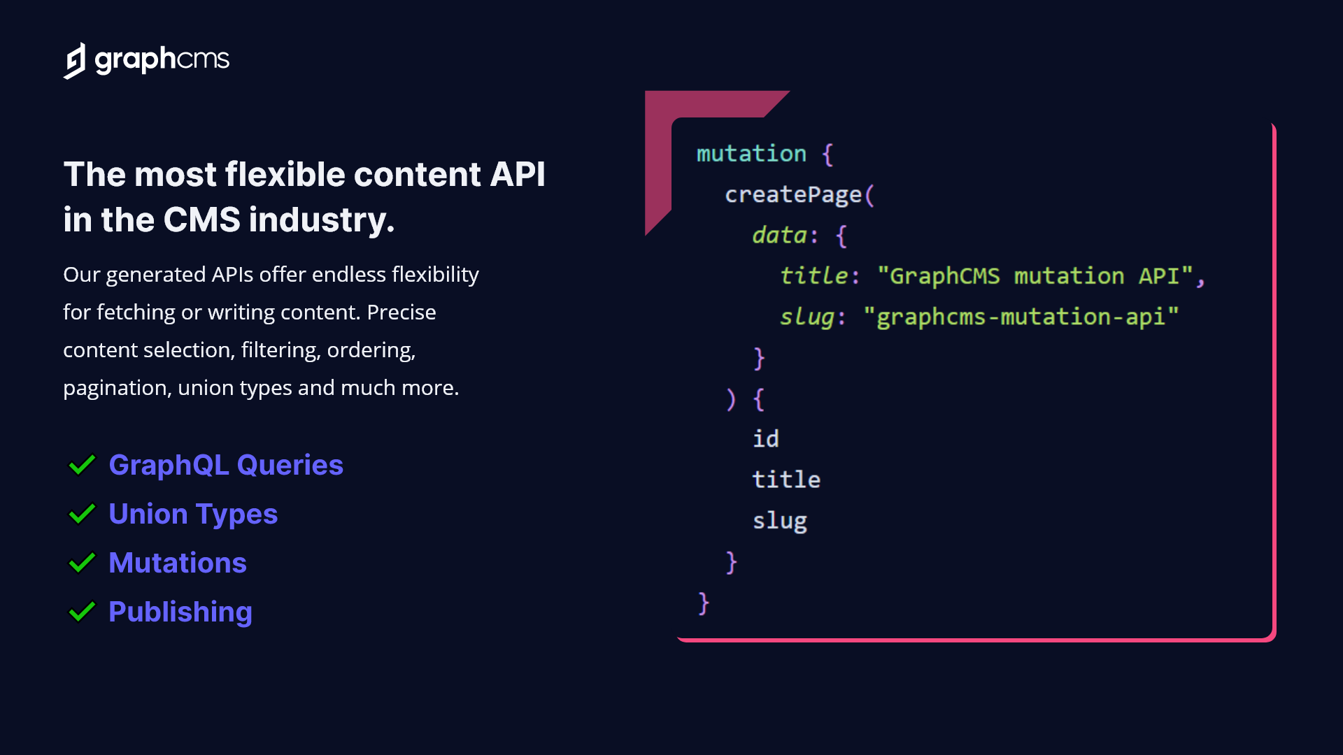 As the first GraphQL native Headless CMS, our mission is to remove traditional content management pain points by using the power of GraphQL, and take the idea of a Headless CMS to the next level.